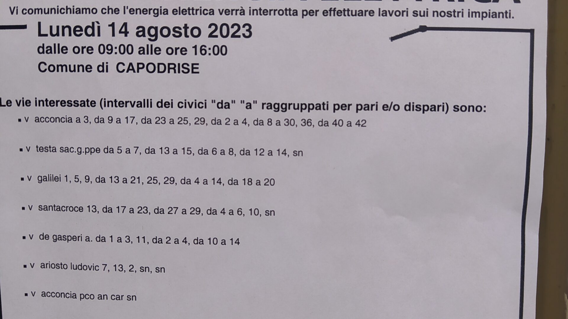 CAPODRISE: LUNEDI’, 14 AGOSTO, INTERRUZIONE ENERGIA ELETTRICA ( VEDI STRADE INTERESSATE) 13 Agosto 202312 Agosto 2023 ECCO L’AVVISO: