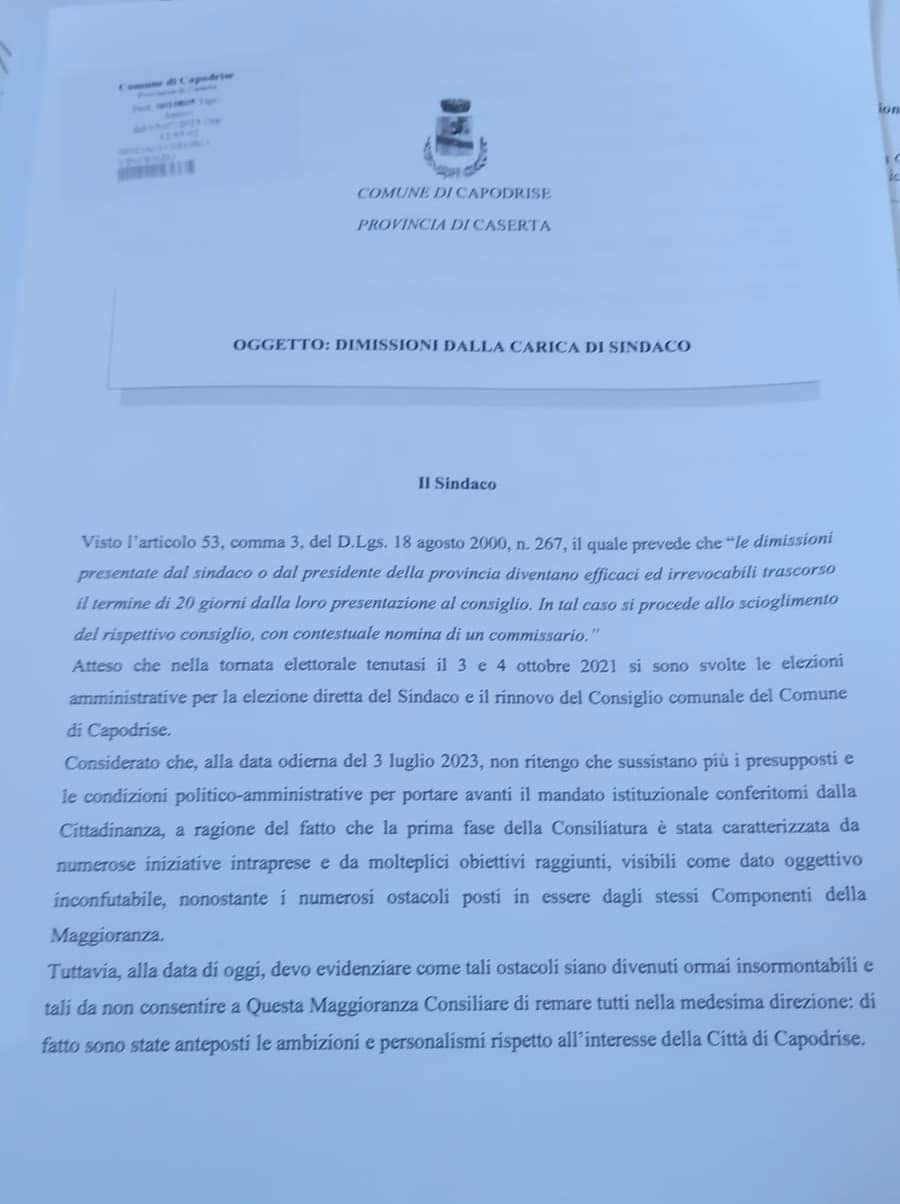 CAPODRISE: SI E’ DIMESSO IL SINDACO NEGRO