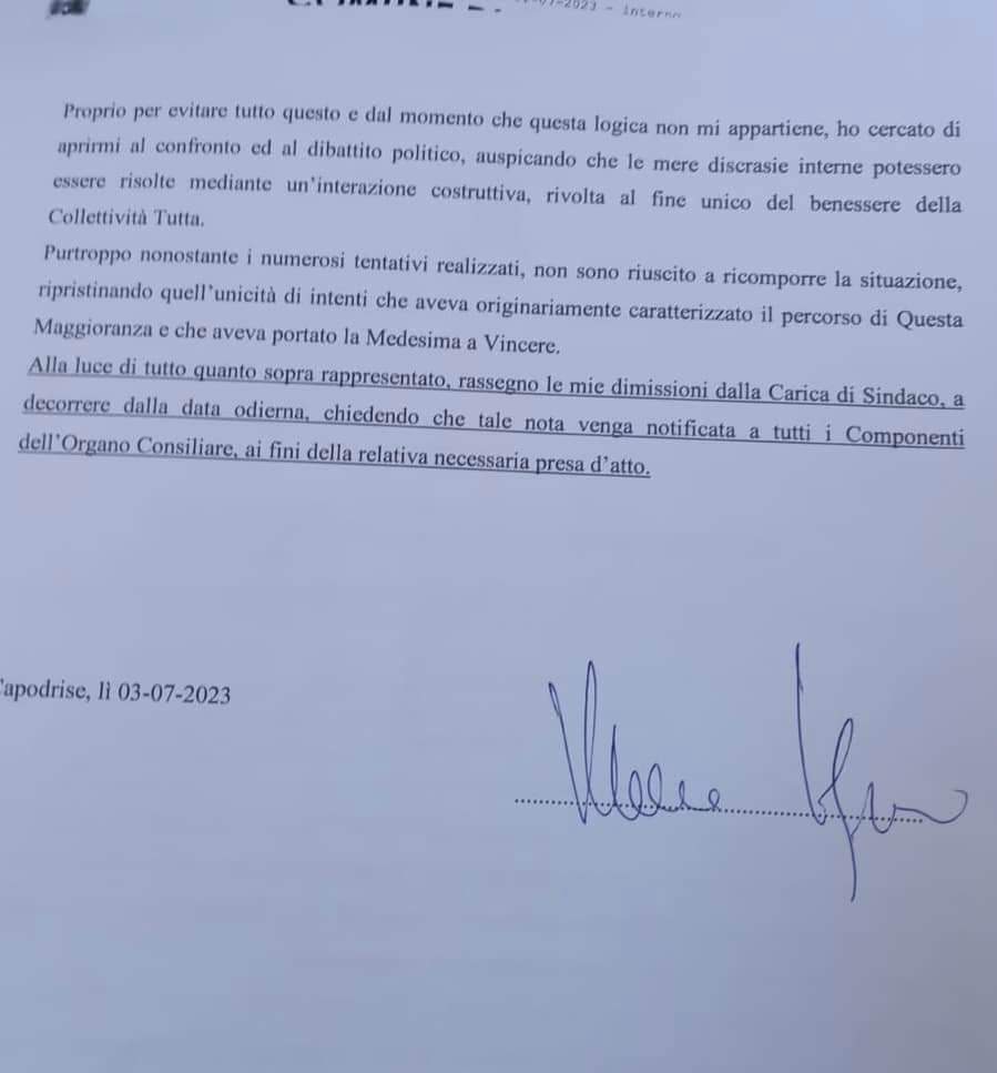 Ritenendo non più sussistenti i presupposti e le condizioni politico-amministrative per proseguire il mandato istituzionale conferitomi dalla Cittadinanza, rassegno le mie dimissioni dalla carica di Sindaco.