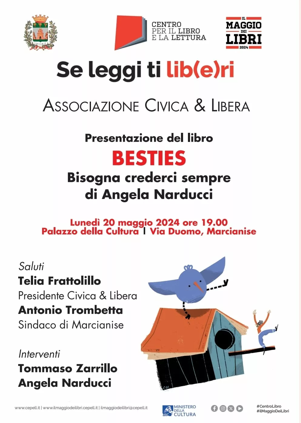 Lunedì 20 maggio, alle ore 19.00 presso il Palazzo della Cultura in via Duomo si terrà la presentazione del libro ‘Besties. Bisogna crederci sempre’ di Angela Narducci promosso dall’associazione Civica e Libera.