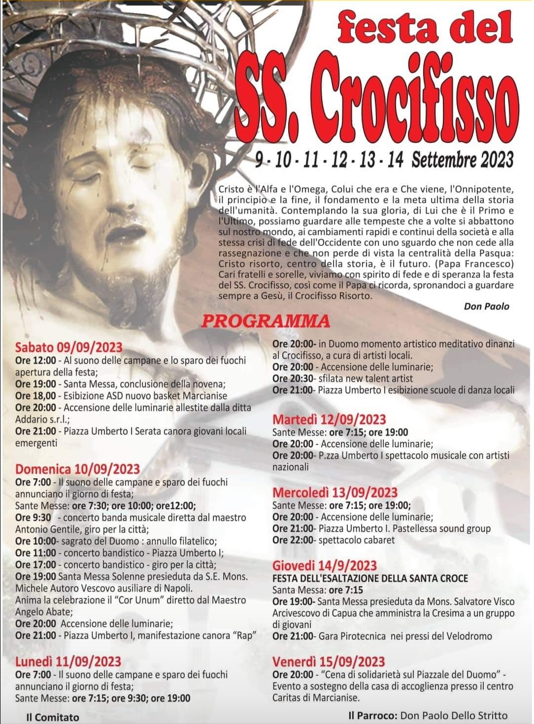 MARCIANISE: ECCO IL PROGRAMMA CON TUTTI GLI EVENTI LITURGICI, GLI SPETTACOLI, LE INIZIATIVE CULTURALI E SPORTIVE DELLA FESTA DEL CROCIFISSO ( SCARICA PROGRAMMA ) 7 Settembre 2023 QUI DI SEGUITO GLI EVENTI: