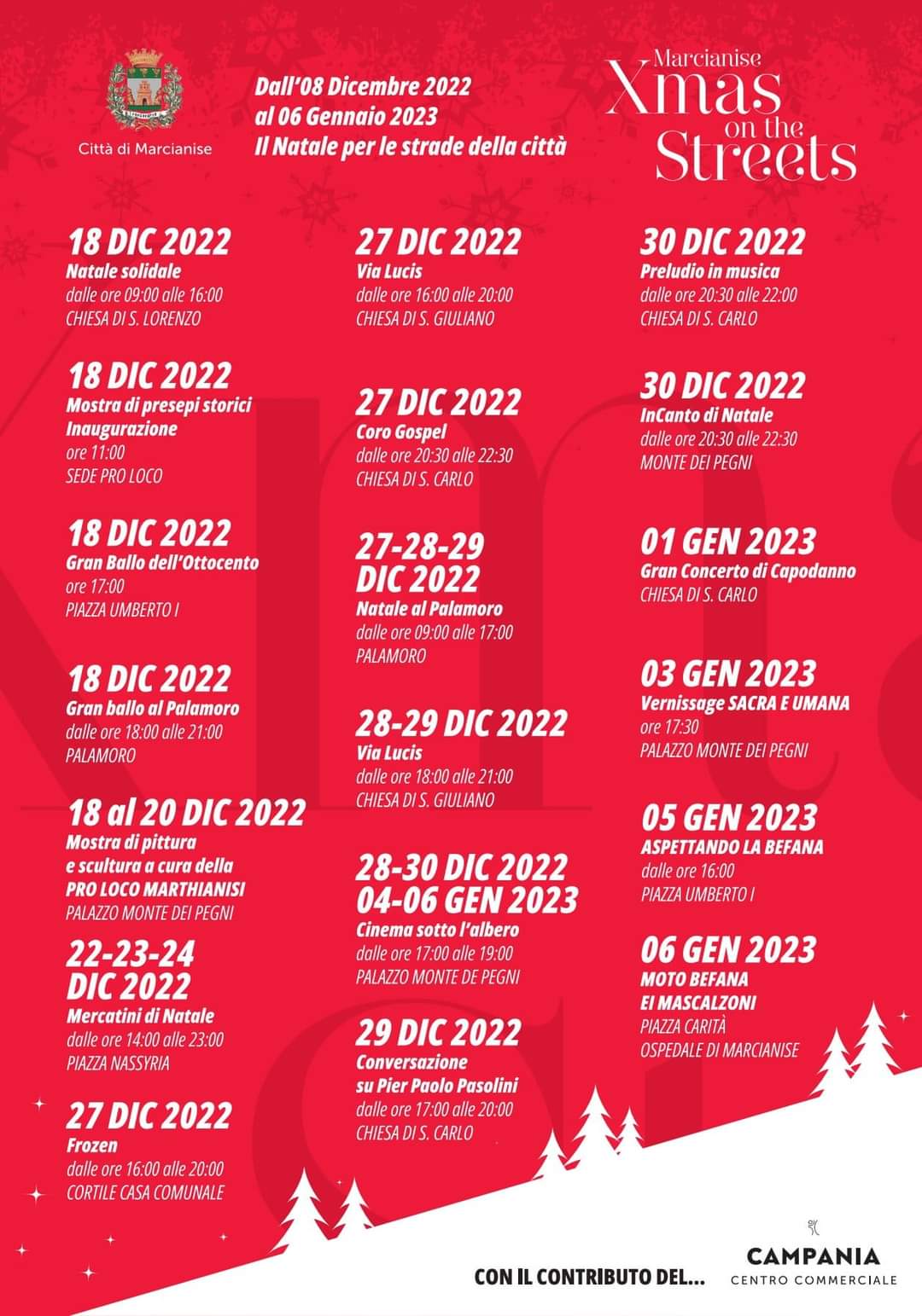 MARCIANISE: ECCO IL PROGRAMMA DI XMAS ON THE STREETS DALL’ 8 DICEMBRE AL 6 GENNAIO 20 Dicembre 2022 QUI DI SEGUITO TUTTI GLI EVENTI: