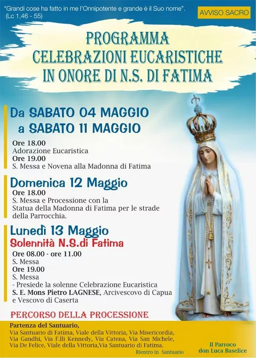 Ecco il calendario degli appuntamenti religiosi presso il santuario di Nostra Signora di Fatima retto da don Luca Baselice: