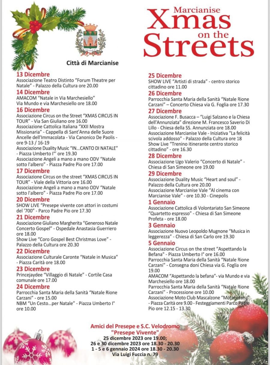 MARCIANISE: ECCO TUTTE LE INIZIATIVE PER IL NATALE DAL 13 DICEMBRE AL 5 GENNAIO 14 Dicembre 2023 Ecco il programma: