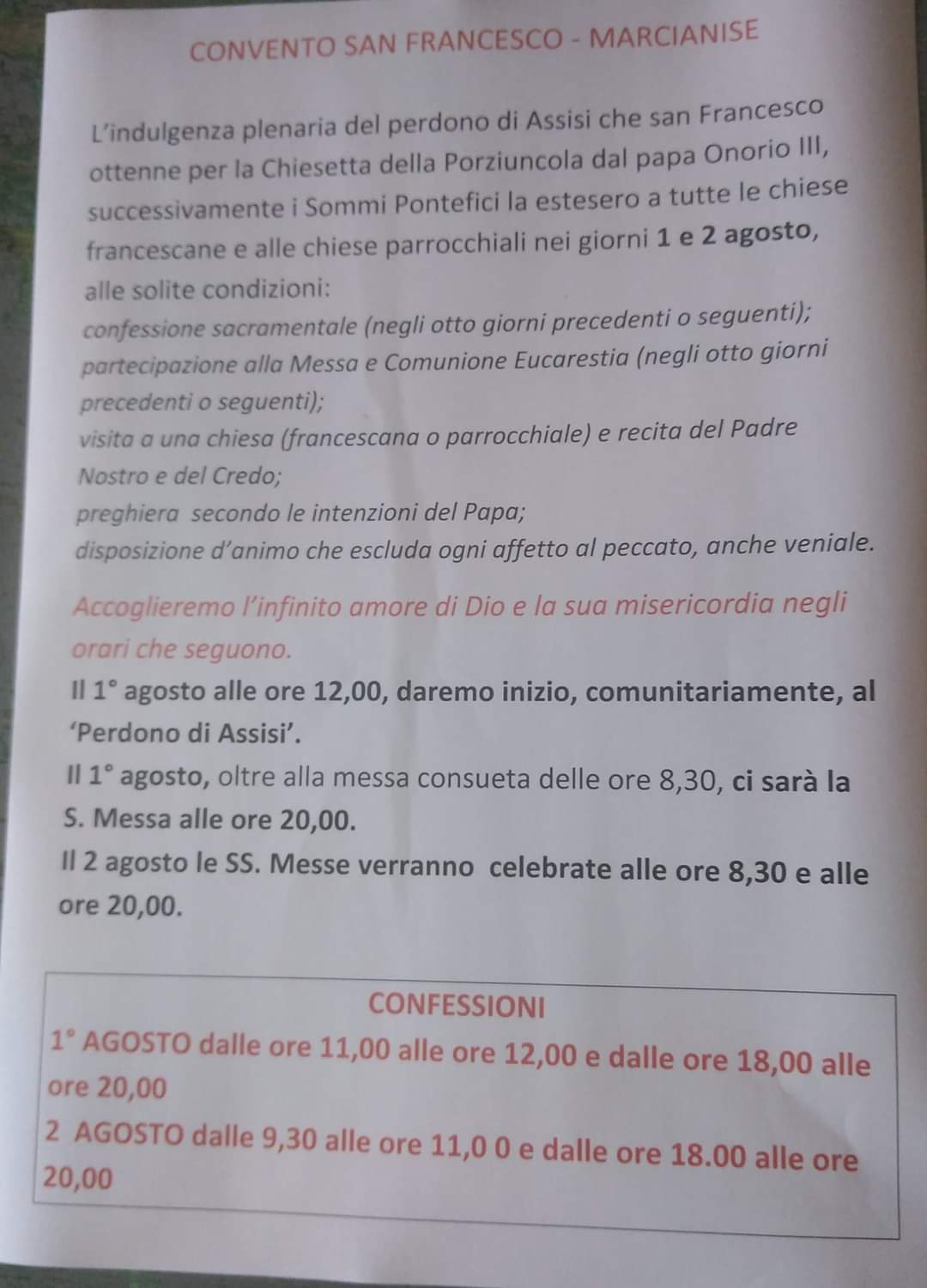 Si tratta di un’indulgenza plenaria che può essere ottenuta in tutte le chiese parrocchiali e francescane dal mezzogiorno del 1º agosto alla mezzanotte del 2 e tutti i giorni dell’anno visitando la Chiesa della Porziuncola di Assisi dove morì San Francesco. Il Poverello ottenne l’indulgenza da papa Onorio III il 2 agosto 1216 dopo aver avuto un’apparizione presso la chiesetta. Qui di seguito il programma: