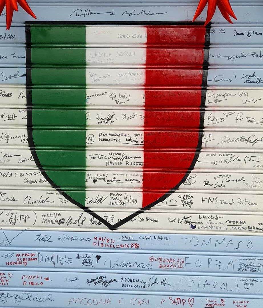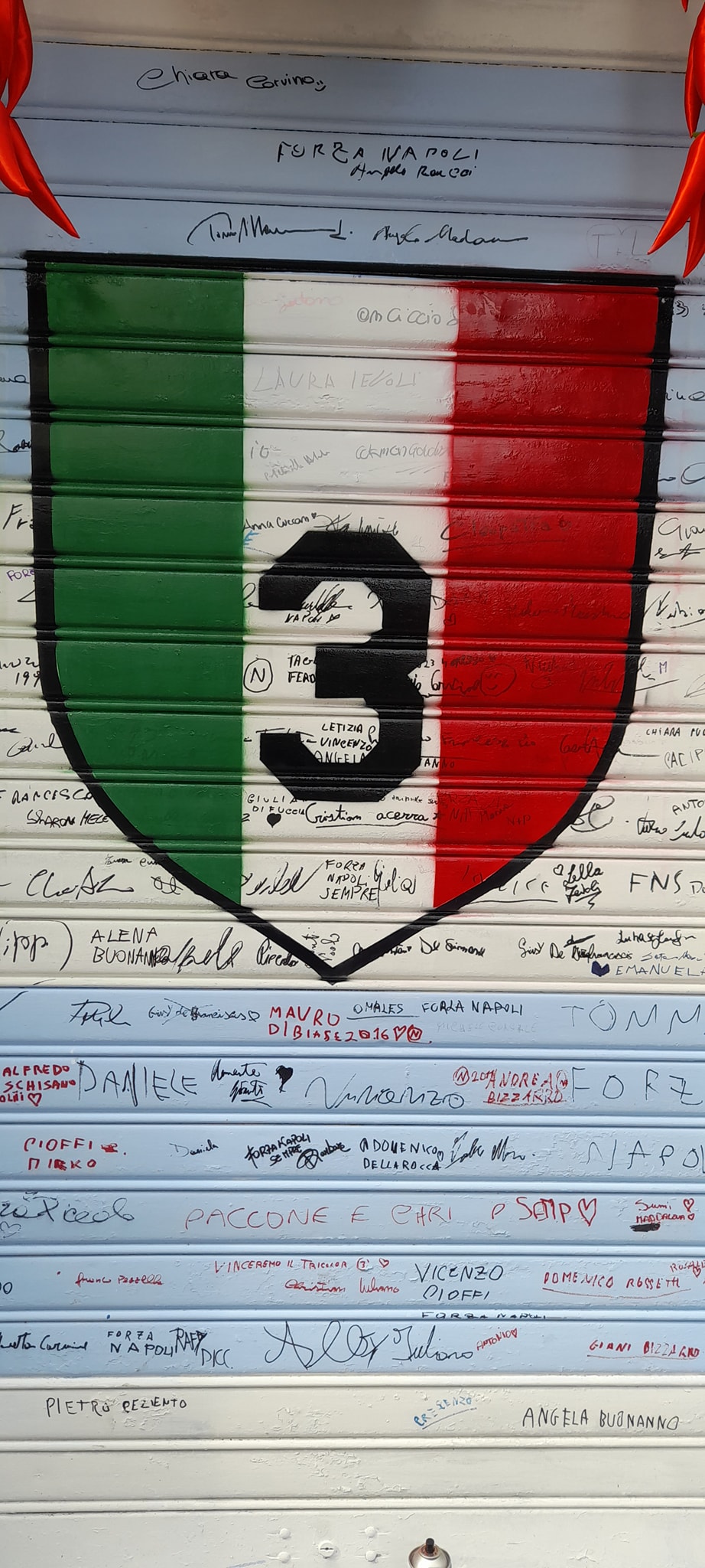 Nel pomeriggio di ieri, è stato realizzato con le bombolette spray lo scudetto nella parte centrale della serranda dove i visitatori, a termine della visita, lasciano la loro firma.