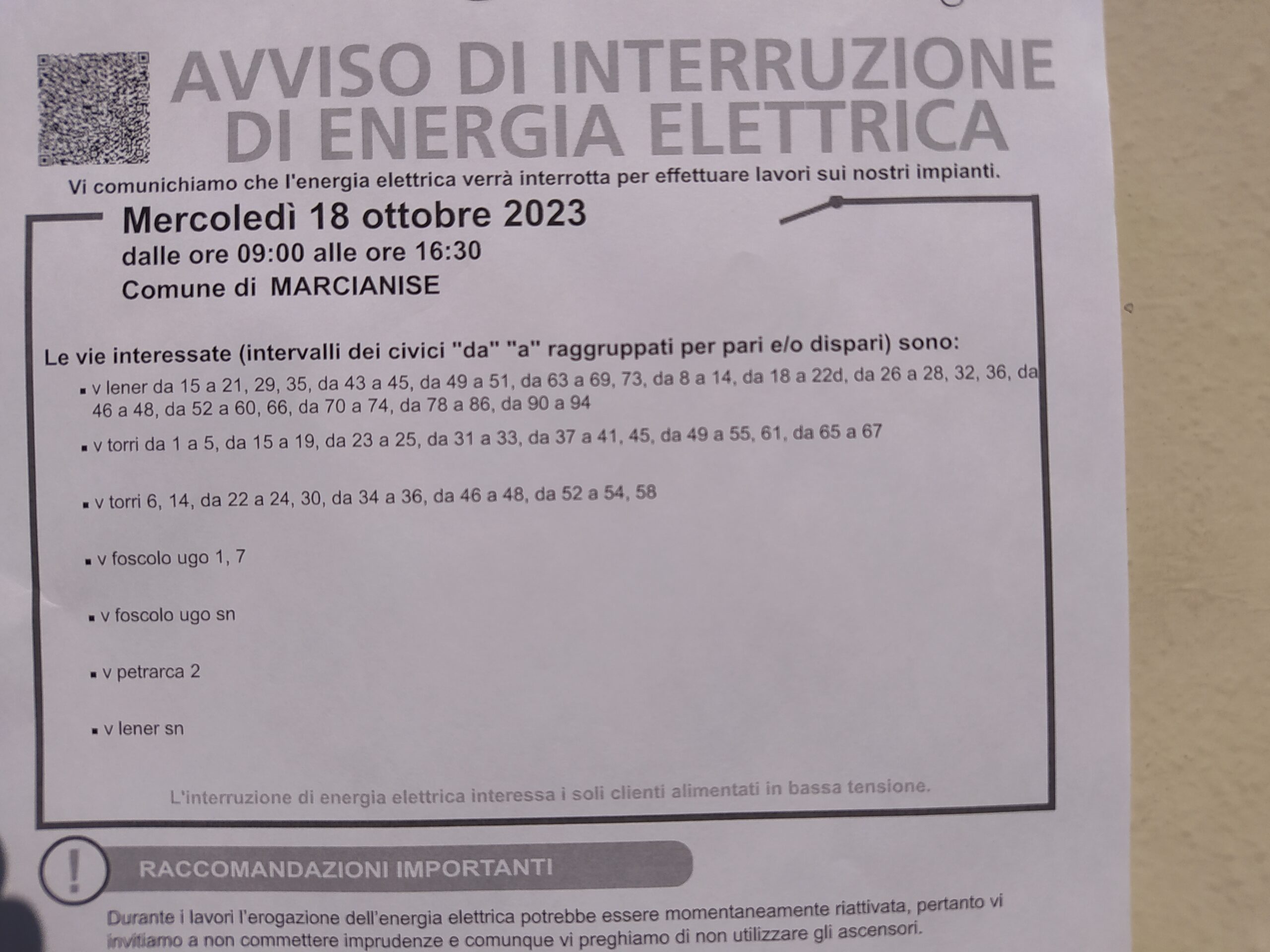 MARCIANISE: MERCOLEDI’ PROSSIMO, 18 OTTOBRE, INTERRUZIONE ENERGIA ELETTRICA ( VEDI STRADE INTERESSATE) 14 Ottobre 2023 QUI DI SEGUITO L’AVVISO: