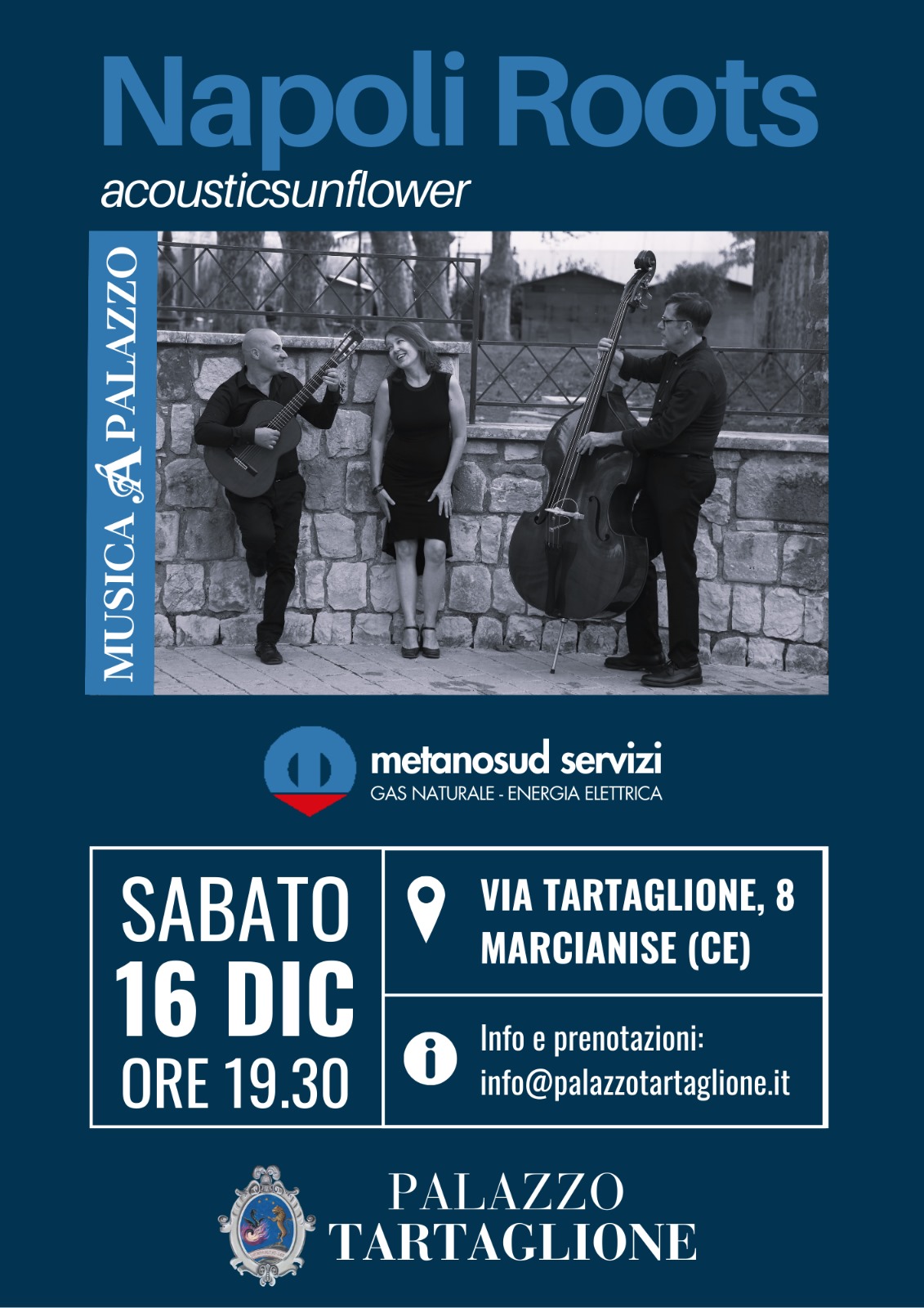 Sabato 16 dicembre 2023, alle ore 19.30, Palazzo Tartaglione, sito in via Tartaglione n.8 a Marcianise (Caserta), nell’ambito delle iniziative volte alla divulgazione dell’arte e della cultura, ospiterà un concerto musicale. Ad esibirsi sarà il trio “Napoli Roots” costituito da Cristina Pucci (voce), Guglielmo Grillo (chitarra) e Maurizio Castellano (contrabbasso). L’iniziativa si svolge in collaborazione con Metanosud Servizi.