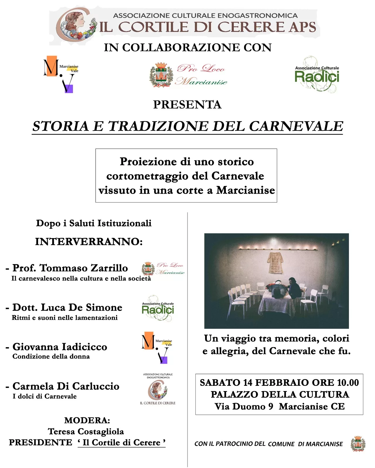 MARCIANISE: SABATO 14 FEBBRAIO, PROIEZIONE DI CORTOMETRAGGIO E DIBATTITO SULLA TRADIZIONE DEL CARNEVALE AL PALAZZO DELLA CULTURA 10 ore fa Ecco l’ evento: