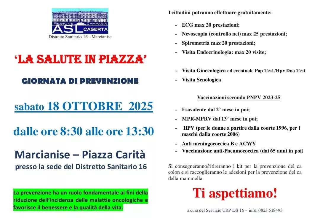 MARCIANISE: SABATO PROSSIMO 18 OTTOBRE ECG, SPIROMETRIA, NEVOSCOPIA, VISITE GINECOLOGICA, TIROIDE, SENOLOGICA GRATUITE IN PIAZZA CARITÀ