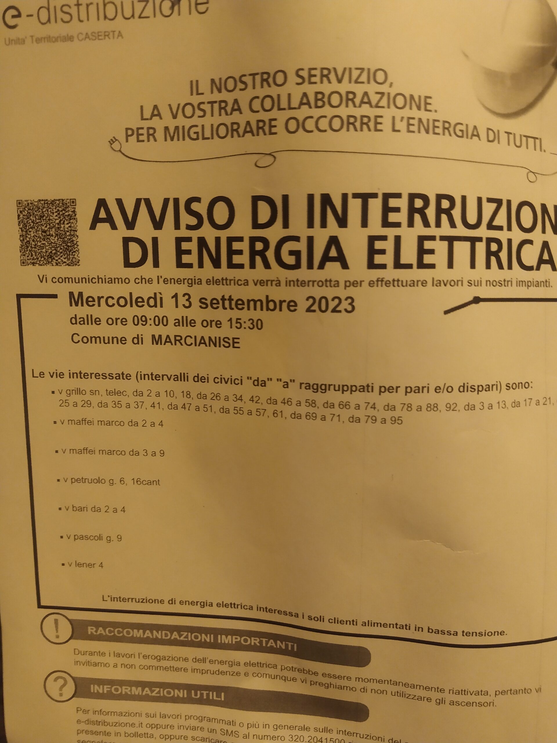 MARCIANISE:MERCOLEDI’ PROSSIMO INTERRUZIONE ENERGIA ELETTRICA NEL CENTRO ( VEDI STRADE INTERESSATE) 10 Settembre 2023 ECCO L’AVVISO: