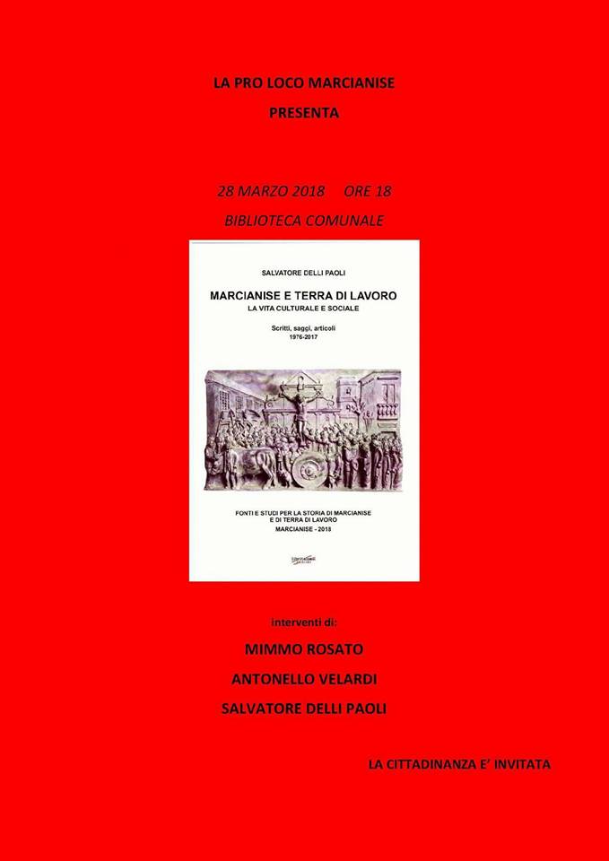Marcianise-L’appuntamento organizzato dalla Pro loco di Marcianise è alle 18 presso la Biblioteca comunale e intervengono il presidente del sodalizio Mimmo Rosato, il sindaco Antonello Velardi e l’autore. “Raccolgo in questo volume una selezione di articoli, ma anche testi di conferenze, piccoli saggi, presentazioni di libri-scrive Delli Paoli-che hanno avuto diversa genesi e che si legano in qualche maniera tra di loro, essendo stati scritti per illustrare monumenti, luoghi, momenti, personaggi, e vicende della vita culturale e sociale di Marcianise e di Terra di Lavoro nel corso del tempo. Per