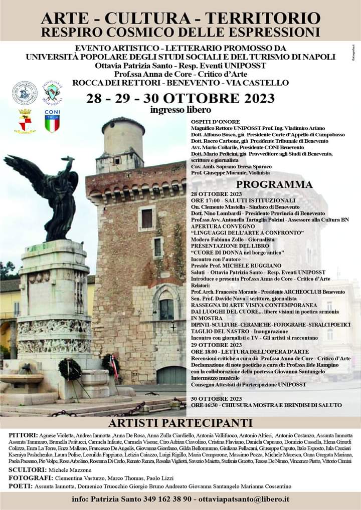 Una mostra di tre giorni imperdibile per un PROGETTO ARTISTICO LETTERARIO nello storico, mitico scenario della ROCCA DEI RETTORI, sito in piazza Castello a BENEVENTO, sede del MUSEO E DELLA PROVINCIA. Un programma ricco di cultura ed arte.
